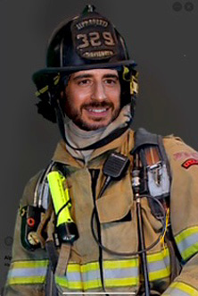 | Actor Jonathan Roumie, who plays Jesus in the TV series "The Chosen" here portrayed in firefighter turnout gear. He claims to have worked with firefighters in the past. |