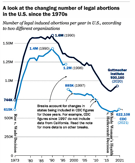 I think we should have left Roe v. Wade alone and concentrated on helping poor families raise their children, which Trump is in the process of making unbelievably more difficult. While it is true that there was a drastic increase in abortions in the eight years following that decision, the number seems to have remained steady for ten years and then began a decline that was reversed during the first Trump administration. According to the chart below, if we had done that, procured abortions would have reached zero around the year 2050.